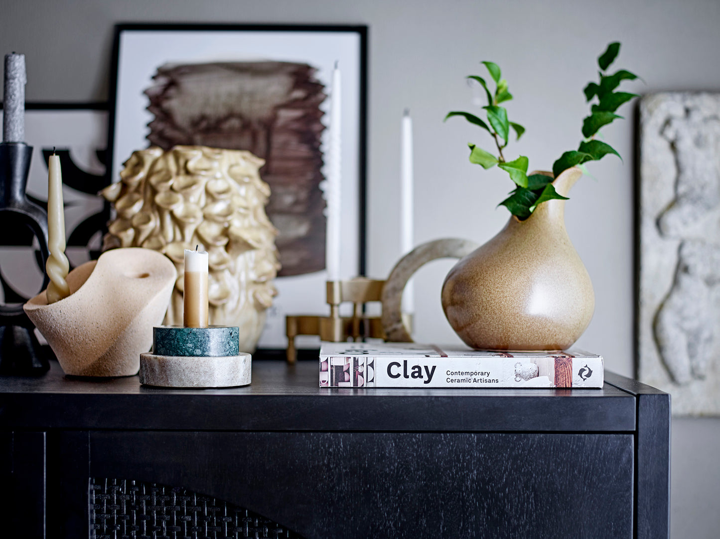 Der Kerzenhalter Bijan ist aus Polyresin gefertigt. Er hat einen schwarzen und metallisch rohen Look.