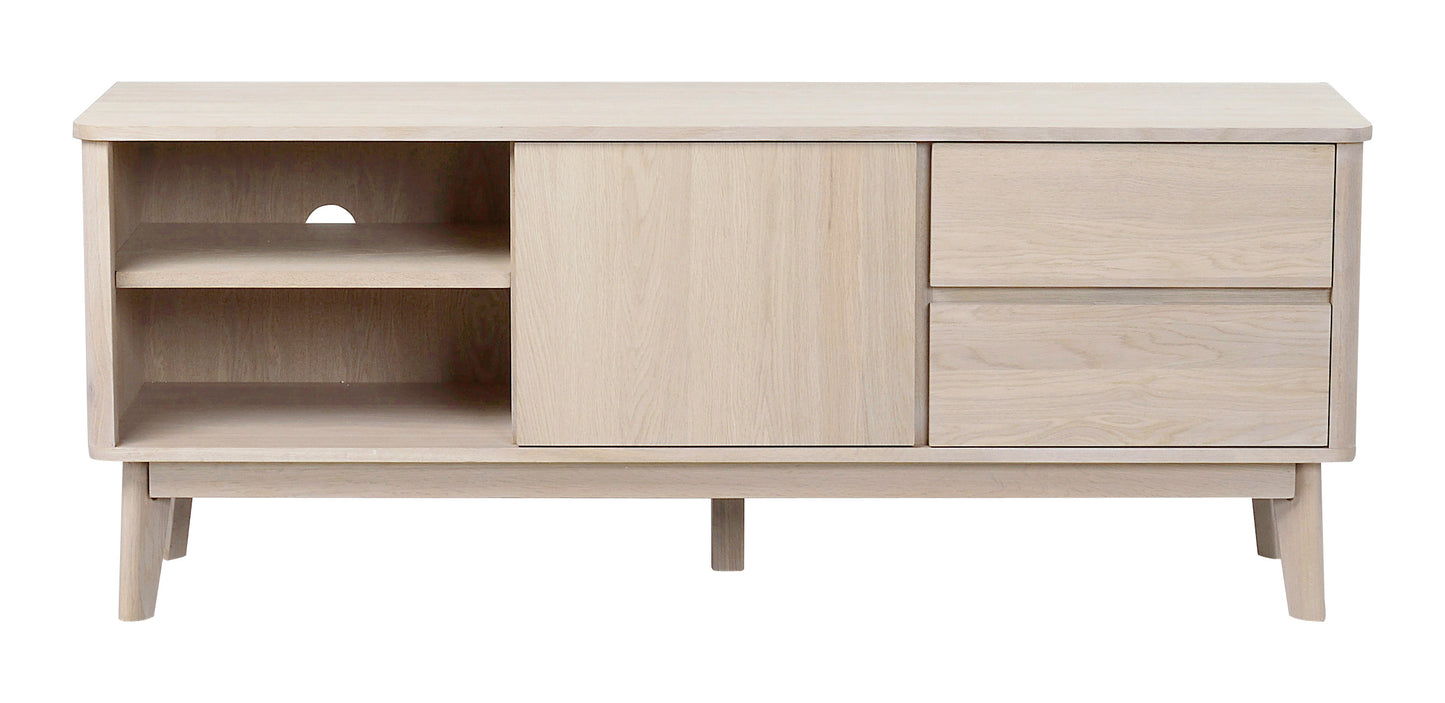 Stilvoller TV-Schrank Yumi in trendigem Whitewash für deinen Fernseher. Praktische rechteckige Form schafft viel Platz für Zubehör. Perfekt für entspannte TV-Abende.